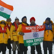 After cutting through the frozen Arctic Ocean, the Ice breaker reached the North Pole at 90 degrees North at 11:57 pm on 15th July 2009. On arrival all the passengers made a circle with their hands joined symbolising world peace circling the North Pole Banner planted in the frozen ice.This was a proud moment for India when for the first time four people living in India landed at the pole and proudly held the Indian flag. Mr. and Mrs Badri from Mumbai and Sardarni and Sardar Gurpreet Singh Anand from India carried the flag.