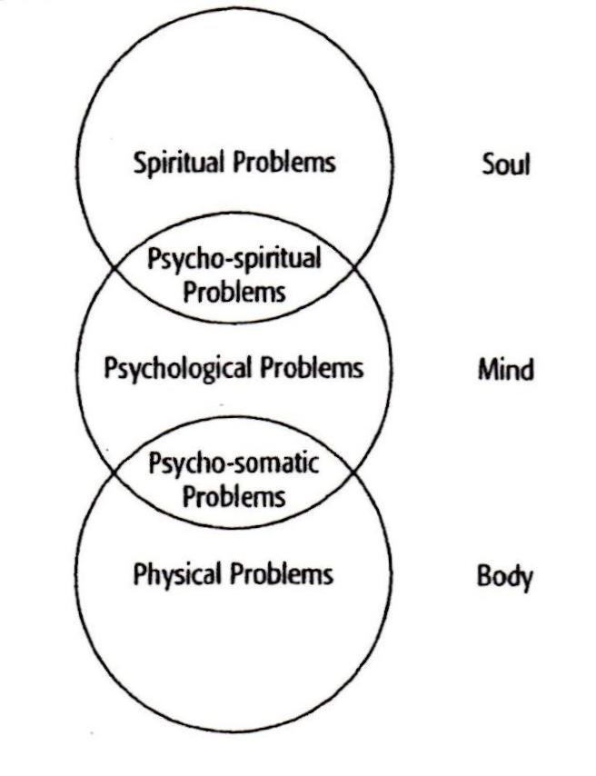Human problems can be broadly classified into three main categories. Namely, problems of the body, mind, and the soul. In addition, it can be pictorially shown that the human mind is capable of affecting both the body and the soul.