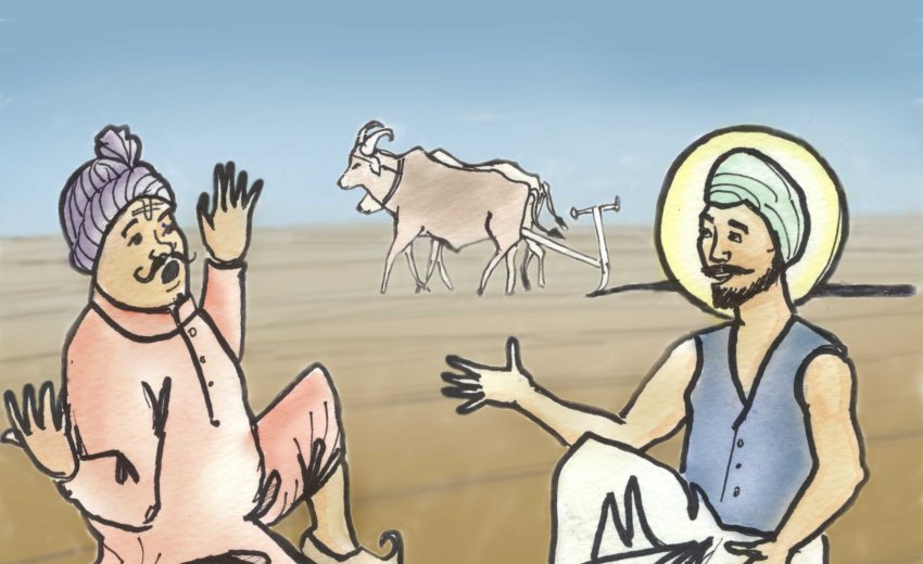 One day, the pundit walked by Dhanna's hut. Dhanna ran out excitedly, "Pundit ji, I can't thank you enough.Thakur is the best! He sings the most beautiful songs!" The pundit was confused and asked, "Your Thakur sings?" Dhanna said, "Oh yes, and he makes the best lassi too. And look, he even helps me in the fields!" Sure enough, the plow in the field was moving but the pundit couldn't see anyone driving the cows.