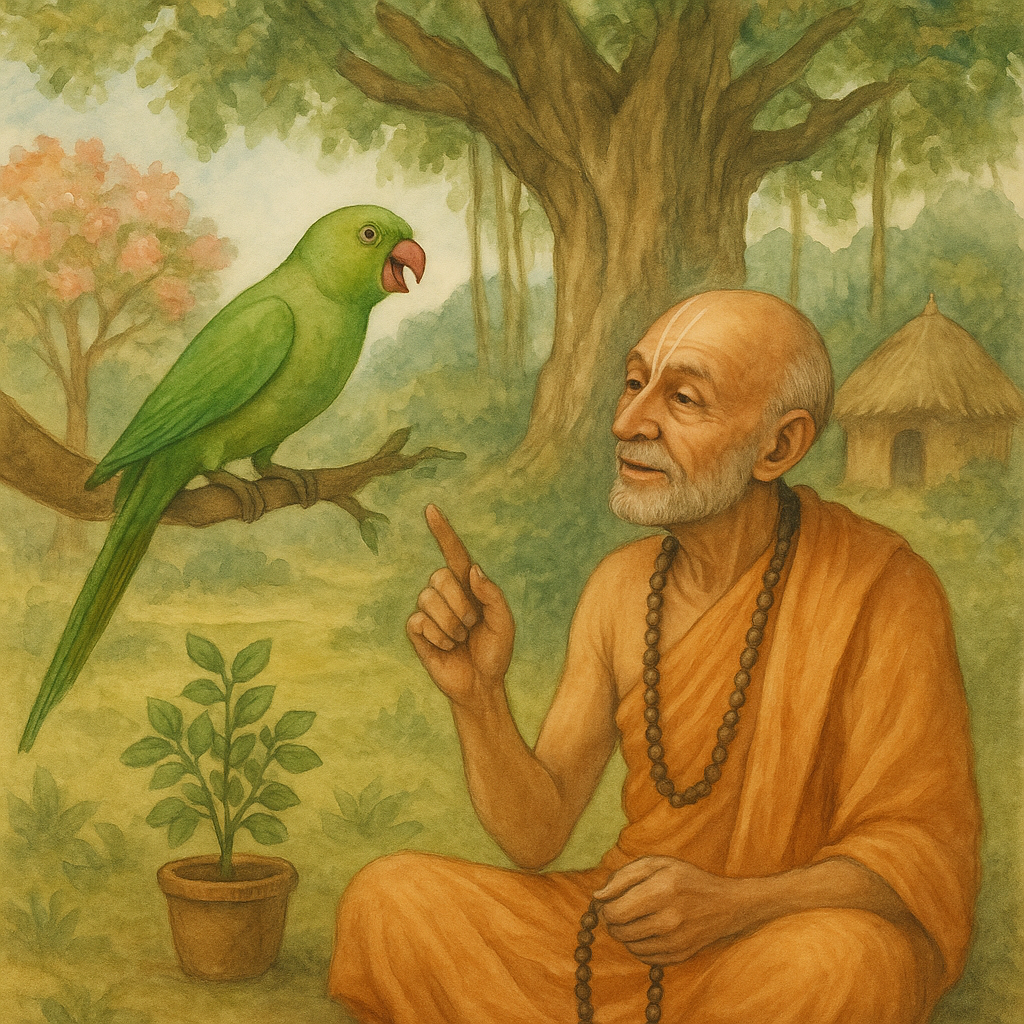 On a very thunderous and rainy night, a sadhu came by. With him, he had a parrot. On seeing the very bad weather and worried that his parrot may die from the cold, the sadhu took the parrot out of his cage and wrapped him in his shawl. This parrot meant a lot to the sadhu, as the parrot caused him to remember the Lord as it chanted the Lord’s Name, Ram, Ram.