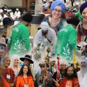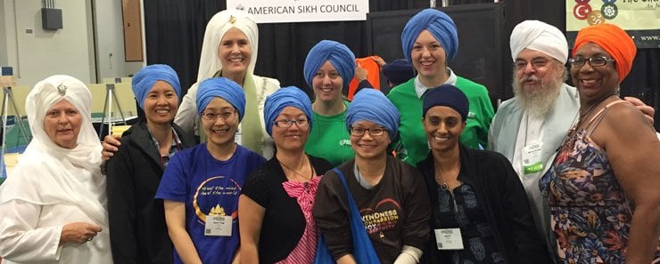 All over the Salt Palace Convention Center, where the Parliament is being held, many people sport their own Sikh turban. Orange, blue, red and yellow - many different colors. The American Sikh Council has brought in volunteers to help tie turbans on people's head. This turban tying exercise builds visibility of the Sikh faith both among those who decide to wear a turban for a day, and all who see them.