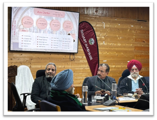 The symposium concluded with a Kavi Darbar dedicated to the celebrated Kashmiri poet Gyani Kartar Singh Komal (1913–1992). The event was organized at the Seminar Hall of the Vice-Chancellor’s Secretariat Building, SKUAST-Kashmir. The Hon’ble Vice Chancellor, Prof. Nazir Ahmad Ganai, and Registrar of SKUAST-Kashmir graciously inaugurated the Kavi Darbar with their presence, lending further significance and warmth to the literary gathering. The event was chaired by Prof. Shad Ramzan, Distinguished Professor at the Central University of Kashmir, and was graced by Dr. Kirat Singh Inqlabi and Ratan Singh Kanwal as the Chief and Special Guests, respectively. The poetic gathering brought together poets of Urdu, Kashmiri, and Punjabi dialects, featuring recitations by Dr. Rashid Azeez, Dr. Azmat Alam Khan, Dr. Maninder Singh Sufi, Dr. Harpal Singh, Kanwalnain Singh, Harpal Singh Pali, Sehaj Kaur, Principal Ichhpal Singh, Paramjit Singh Premi, Paramvir Singh (Canada), Ranbir Singh Bir, Khushdeep Kaur, Prabjot Singh Sangha, Kawalpreet Singh, Jaswinder Singh, Mangat Singh, Karnail Singh, Sumeet Kaur, Ekam Singh, Sandeep Sharma, Komalpreet Singh, Novdeep Singh, and Kulbeer Singh Badal. The Kavi Darbar was hosted by Surinder Singh and Harkamalpreet Singh.