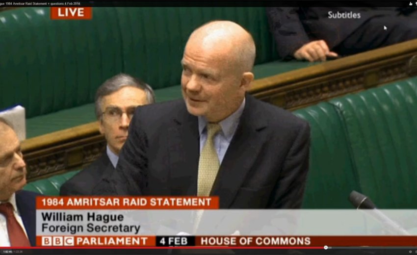 UK Foreign Secretary William Hague gave a statement today presenting the report on the collaboration of the UK and Indian government in 1984 in an open session with British Members of Parliament (MP’s).