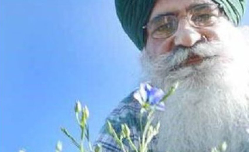Tarlok Singh Sahota inspects a flax crop that he is experimenting with at the Thunder Bay Agricultural Research Station.
