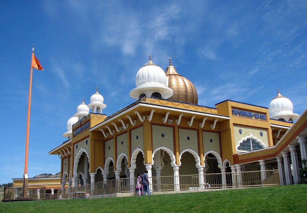 The Sikh place of worship, or Gurdwara, is more than a place of worship. It has historically served as a refuge for the homeless and the destitute. Gurdwaras usually display the Nishan Sahib, a saffron-colored triangular flag bearing the khanda, the symbol of the Sikh faith. Visitors, irrespective of their religion, are offered shelter, comfort, and food. The prerequisites for entering a Gurdwara are removing shoes and covering one’s head with a handkerchief, scarf, or other cloth.