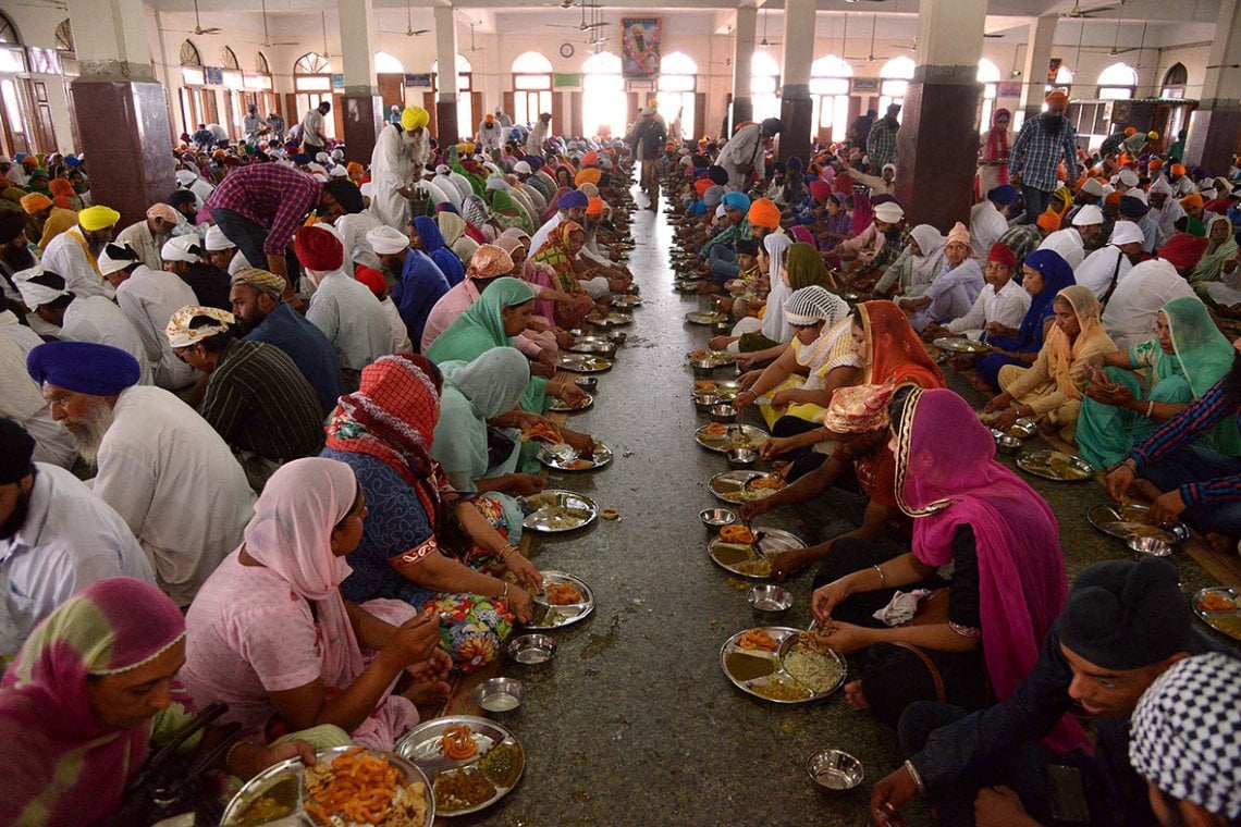 In a Gurdwara, no special place or seat may be reserved or set aside for any dignitary, as all are considered equals. The service consists of singing of the liturgy, as well as the exposition of Sikh history, tradition, and theology. Non-Sikhs are always welcome. Sikh gurdwaras all over the world usually run free community kitchens, which provide meals to all. These kitchens are run and funded by volunteers. In traditional Indian society, people of high and low caste were rigidly segregated. To combat this social problem, the Sikh community kitchen, or langar, requires everyone to sit side by side and eat together, thereby teaching the concept of equality by shattering all barriers of caste and class. Every major city in the United States and Canada has Sikh gurdwaras and they are open to all.