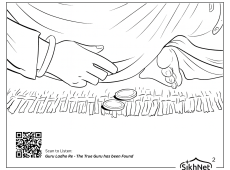 ਮੱਖਣ ਸ਼ਾਹ ਜੀ ਨੇ ਬੜੇ ਸਤਿਕਾਰ ਨਾਲ ਦੋ ਸੋਨੇ ਦੇ ਸਿੱਕੇ ਗੁਰੂ ਜੀ ਦੇ ਚਰਨਾਂ ਅੱਗੇ ਰੱਖੇ।