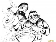Jamaal Khan brought Bhai Gopal to the Emperor. The Emperor knew that Bhai Gopal was a Sikh of the Guru and that he would not lie. He also knew that Jamaal Khan wouldn’t lie either. So he had an idea, “Get a big bowl and fill it with oil. Light a fire under it and boil the oil. Then put a coin in the boiling oil. Both of you will have to try to pick out the coin from inside the bowl of boiling oil.” Both men were shocked. “Bhai Gopal you will go first. Try and pick the coin from the hot oil.” So Bhai Gopal folded his hands in prayer. “Guru Ji, you are my protector, you always take care of me when I am in need. I know you will save me now. Thank you, my beloved Guru.” He reached his hand out and began to put it in the burning hot oil. His hand kept reaching and reaching until he had pulled it out with the coin. “Bravo!” Said the Emperor. Look! His hand was not hurt or burned at all!