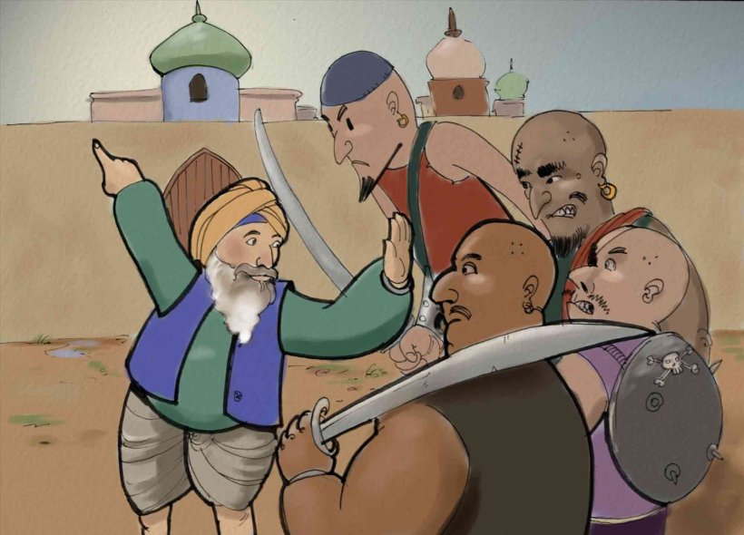 The other bandits started giving their comments too, saying, "We shouldn't kill him! If we do we will all surely die!" Then just as calmly as before, the very old and wise Bhai Sud said, "Well if you don't kill me, I would still advise you to leave right now, and leave fast, because I have no idea when these villagers are going to attack!" And like magic, as suddenly as they arrived the bandits thundered off on their horses and the village was saved.