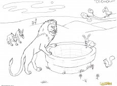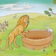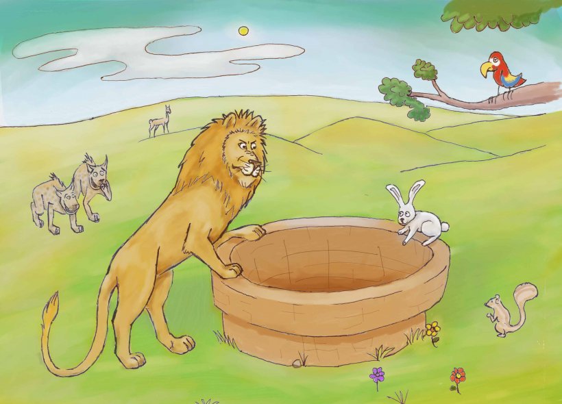 So the rabbit told him, "Follow me, I'll show you". They came to a clearing in the jungle where there was a well. The rabbit said, "Put your head in there and roar". So the lion roared in the well. The roar echoed back very loudly. The lion, a little bit nervous now, asked, "Who is that? Is that another lion??" The rabbit said, "Yes it is. He's down there and he says he's the real king of the jungle and the he's much greater than you".