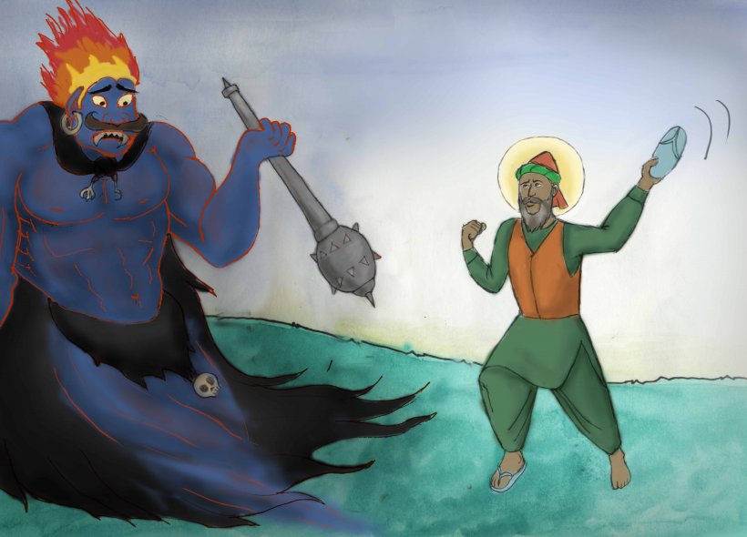 The Messenger went to Bhagat Kabir and got ready to beat him. But Kabir wasn't afraid like other people. He was so fearless that he took off his own chappal, his sandal, and started beating the Messenger!!