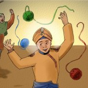 Near his house there was an old woman who spun yarn and she used a wheel to spin raw cotton into yarn balls. One day Gobind Rai decided to make a little mischief, and he snuck up behind her chair. She couldn’t see him and suddenly he knocked her basket of yarn balls on the ground and ran away. The balls of yarn had taken ages to spin and got all dirty and dusty. So the old woman got really angry with him. She picked up a big stick and waved it wildly in her hand while shouting at Gobind Rai, "Come here you little brat! I've been working on that basket of yarn all day. How dare you knock it down!" She chased him, thinking she would give him a sound beating with the stick. She yelled, "I don't care who your parents are, I'll teach you some manners! Come here boy!" She almost caught him. "Now I gotcha!" she crowed. But he just ran away faster. He kept stopping and starting, dancing near to the old woman but not letting her catch him, and it was really driving the old woman up the wall.