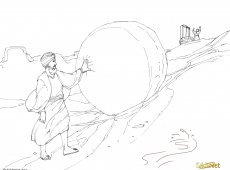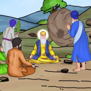 The man spotted a huge boulder nearby and had an idea to crush Guru Nanak. He mustered all his might, and with great effort he managed to roll the boulder over the hill, down towards Guru Nanak and the group near the spring. The boulder rolled down the hill and gained speed as it went. People in the group were scared and quickly rushed out of the way. That is, everyone except Guru Nanak, who was now sitting peacefully in meditation. The huge boulder was headed right for him and it looked like it would run him over and even kill him.