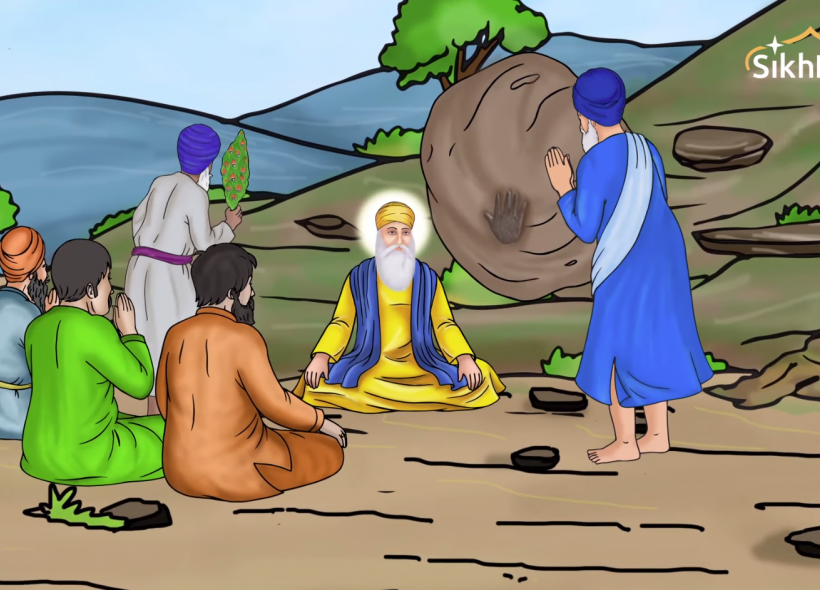 Guru Nanak Dev Ji used to travel on foot everywhere with his companions and musicians, Bala and Mardana. One day they were walking and Mardana felt very thirsty. It was very hot outside and they had been walking for a long time. Finally they reached a hill with a dwelling at the top. They were sure they would be able to get water there. A man lived there and had a well that everyone in the nearby village used to get water for washing themselves, growing food, and drinking. But he was very greedy and charged money before anyone could use the well.
