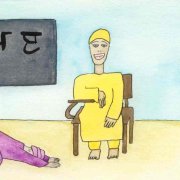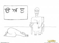 Nanak quickly learned whatever the teacher said. He only wanted to chant God’s name. Sometimes the teacher would leave the students and they were supposed to write down the alphabet to try and remember it. Nanak would tell all his friends about God and about chanting the Naam. When the teacher would come back all the kids would be meditating instead of doing their homework. The teacher said, “Nanak, have you written the alphabet?” and Nanak showed the teacher what he had written.