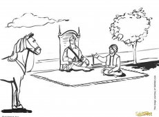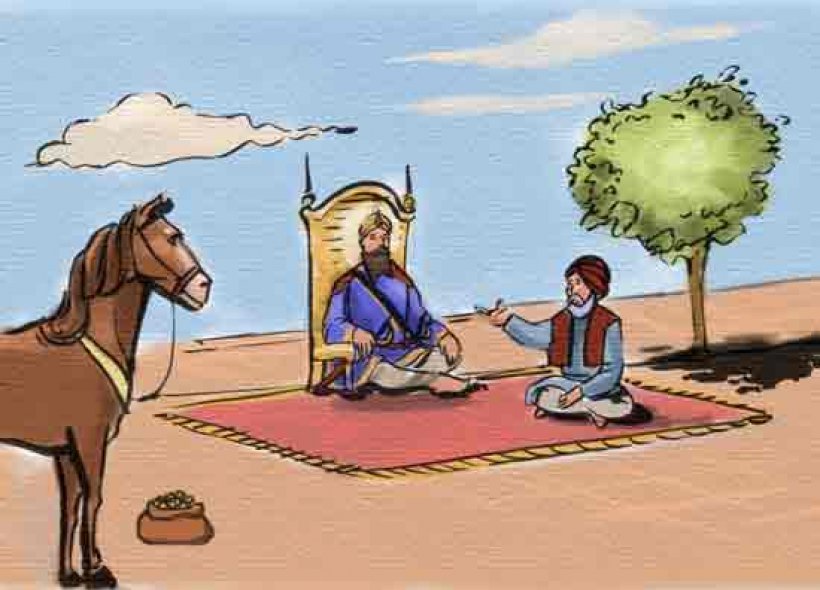 Then one day, a man came in to sing Jap Ji like everyone else. This man had great devotion in him, and he sang with deep purity and beauty. While this man was singing Jap Ji, the Sikhs of Guru Hargobind noticed that the Guru was slowly moving off his throne. They didn’t understand. Toward the end, after Guru Hargobind had gotten nearly completely off his thrown, Guru Hargobind jumped back onto his throne. When the man finished, Guru Hargobind blessed him and then offered him a beautiful horse and some gold for how beautifully he sang Jap Ji Sahib. “Oh my God, Guru Ji, thank you so much! You’ve given me much gold and wealth and a what a wonderful horse you have given to me also! I am so blessed to serve you my King!” Then he bowed down to the Guru, took the horse and gold, and happily went back to his wife and his home.