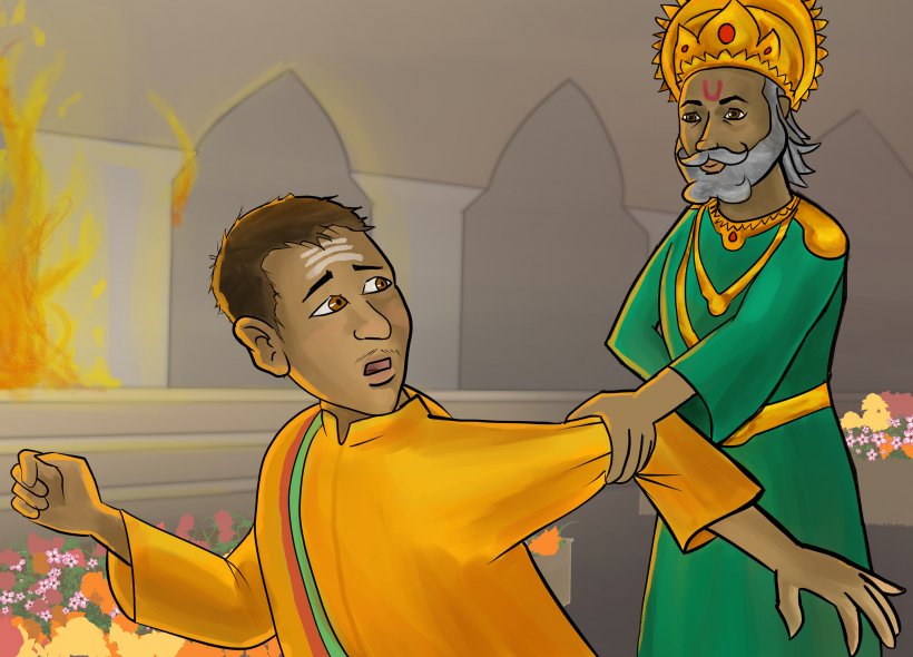 Then they resumed their talk, “I’m sorry for the interruption. You were about to ask another question. Please go ahead.” Sukhdev Muni was still surprised at the king's behavior but went on to ask him more questions. And sure enough the servant came in one more time, “Raja Sahib, the fire is spreading from the hall to this throne room, It’s almost reached the lawn outside right now!"