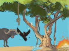 ONCE upon a time, a farmer's wife was sitting and sifting corn. All of a sudden a crow flew by and swooped off with a kernel of corn from her basket. The farmer's wife got really angry and threw a mud ball at the bird. She had such good aim, the mud ball hit the crow, who fell to the ground, the kernel of corn fell out of the crows mouth and it rolled under the roots of a great big Banyan tree. The farmer's wife ran up to the crow, and grabbed it by the tail, "Give me back my kernel of corn, if you don't, I'll eat YOU instead!