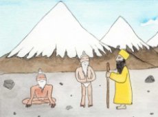 Guru Nanak, together with Mardana and Bala, his two friends who always served him, traveled together to the country of Kashmir. They came to the city of Sri Nagar. There the people knew who he was because of his grace and his light. The people were very happy and blessed to sit with him and learn from him. In that city there was also a Pundit named Brahm Das. He was very learned and through his devotion to the goddess he had gained yogic powers. When he heard that a great Guru had come to town he thought, "I don't think I will be that impressed with this new-comer. It is I who has great knowledge and supernatural powers. I will show him my skill. Sitting on this carpet I will fly over to where he is and there is no doubt that he will be totally impressed when I arrive."