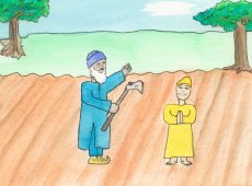 When Guru Nanak was a boy he once took the cows out to graze. He fell asleep and the cows ate all the neighbors crops. When the man found out he told Rai Bular, the village chief, to punish Nanak's father. Everyone went to see the field the cows destroyed. When they got there not only were the plants OK, they were even greener than before. Because Nanak was meditating on God nothing went wrong.