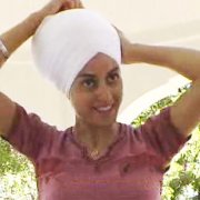 This style originated from the western Sikh communities in America. Most western Sikh women who become a Sikh wear a turban (whether or not they are Amritdhari). This is a common style which is worn. Usually it is at least two layers. One layer of turban fabric and then a white chuni at the final "finished" layer.