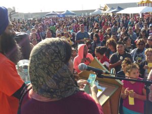 The event included a warm vegetarian meal, giveaways, games and a raffle. Organizers and volunteers distributed 1,500 bags of food, toiletries and amenities, clothes, toys and more to the more than 500 families gathered.