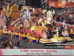 The float features an observant Sikh man with a beard and a bright yellow turban, sitting atop a white horse, on his way to participate in Vasakhi festivities.