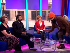 A BBC presenter threatened to eject a panellist live on-air after he attempted to protest about the lack of media coverage of violence against Sikhs in the Punjab.