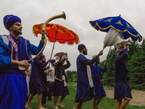 There was a panj carrying swords, another panj carrying nishans (flags), chour seva and umbrellas over both Granths, a trumpet, a drum, a bell, flowers, sprinkled water. The minimum for the procession was 18 to 21 sevadars plus the sangat.