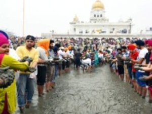 Thousands of Sikh devotees took part in Kar Sewa of Sarovar (nectar tank) at historical Gurdwara Bangla Sahib in Delhi. It was at this holy site that Guru Harkrishan healed the masses from smallpox.