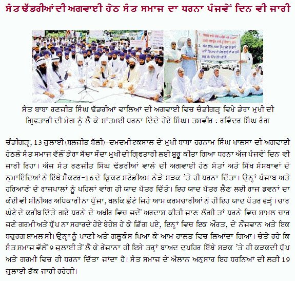 Chandigarh, 13th July 2008 – Co-ordinated by the Sant Samaj, the initiated Dhaarna for the arrest of the Sirsa Dera Chief concluded its fifth session today. Under the command of the Sikh nations renowned Parchaarak Sant Baba Ranjit Singh Ji Dhadrianwale, accompanied by members of the Sant Samaj, Sikh organisations and the Sikh youth, a Dhaarna was held in Sector 16, Chandigarh.