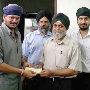 (Photo left: Chipping in: Malkith Singh handing over the cheque to Sarban Singh (left). Also present were SNSM members Jai Nanak Singh (right) and Sukhbeer Singh.)