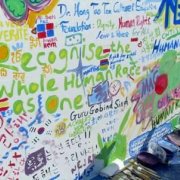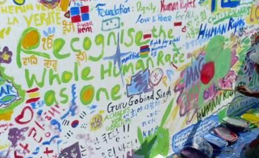 Members of the public and NGOs were asked by the event organisers to write a message in support of human rights on a large canvas that was erected on the square outside the Hotel de Ville. Chris Thomson and Gurpreet Singh decided to write the motto of UNITED SIKHS which derives from the command of Guru Gobind Singh Jee, the 10th Guru of the Sikhs: “Recognise the whole Human Race as one”. The canvas was later shown at various conference sites across Paris including the UNESCO Headquarters, where the Conference took place.