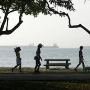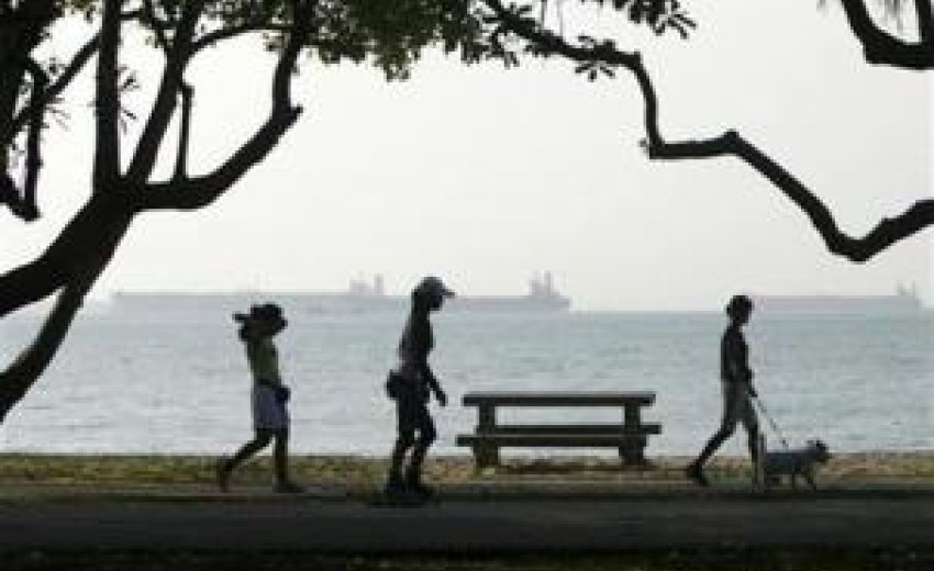 A woman walks a dog as others rollerblade and jog along the waterfront at East Coast Park in Singapore February 7, 2007.
