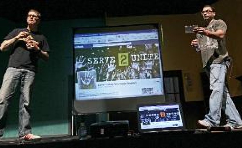 The two men finished their presentation. The students broke into applause and then rose, still clapping. Afterward the speakers stood together by the front of the stage as young men and women approached to shake their hands.