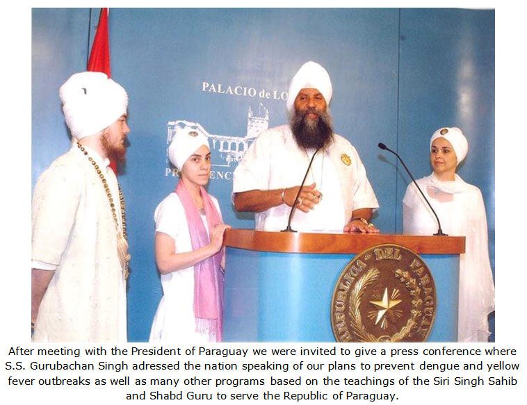 As if all of this wasn't enough, Guru Ram Das had a special surprise for us. On this incredible tour we had the further privilege of meeting the new President of the Republic of Paraguay, Fernando Lugo, and a former Bishop in the Catholic Church. For 35 minutes, we had the honor of discussing Sikh Dharma IberoAmerica, Kundalini Yoga, Seva, and our lifestyle. The President was warm, graceful and engaging during our visit to Palacio Lopez. Moreover, we were able to share with him preventative measures against mosquito born illness's which affect millions in his country. We proposed a national campaign of including ginger, onions and garlic [masala] in the Paraguayan diet as a prevention to any airborne diseases. He was very receptive to the idea and grateful for any help we could give the country. After our private meeting, we were invited to a nationally televised press conference explaining how we can help save lives through this simple addition to their diet.