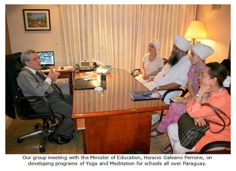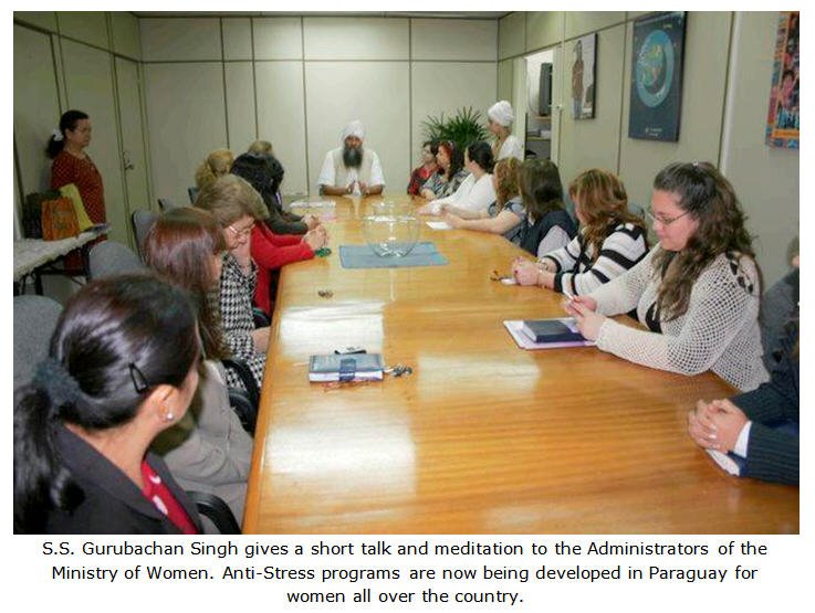 for a 30 minute meditation session to help them with their stress. Within 5 minutes, 25 department heads were seated around a large conference table learning how to meditate and listening to "Japa Man Sat Nam" shabad. By the time we were finished, everyone was literally in bliss. She further requested us to come to the next National Woman's Congress where thousands of women from all over Paraguay will attend so that they too can learn these wonderful teachings. As head of Women's affairs in Paraguay she understands that if the woman is not right, nothing is right neither in the family nor in the society.