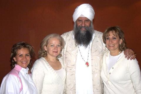 S.S. Gurubachan Singh with (L to R) Gloria Viviana De Leon, Eva De Palomino & Claudia De Naranjo, the wives of the Commandant Generals of the entire National Police of Colombia who also learned meditation.
