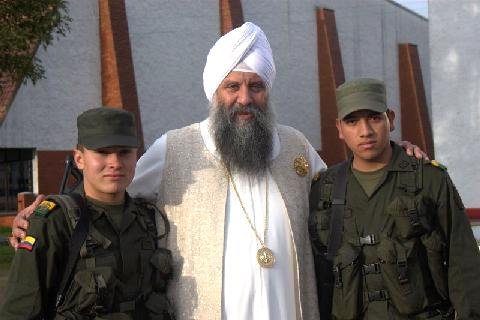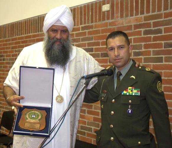 S.S. Gurubachan Singh Khalsa receives the National Shield of honor by the Commandant General of the Metropolitan Police of Bogota. This has been given very rarely over the history of the Police force.