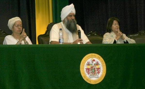 During the first mediation, Dian Kaur and Guru Siimran Kaur [both from Colombia] demonstrate the meditation to an auditorium filled with 400 policemen while S.S. Gurubachan Singh Khalsa guides them.