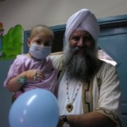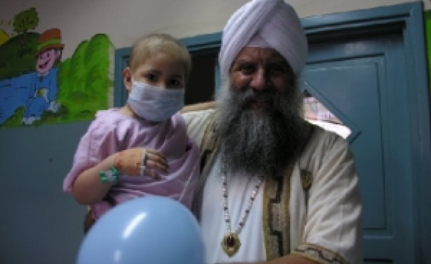 | "S.S. Gurubachan Singh carries a young girl with cancer who is undergoing chemotherapy. Even though these kids were all not feeling well, they were all smiles when we walked in." |