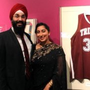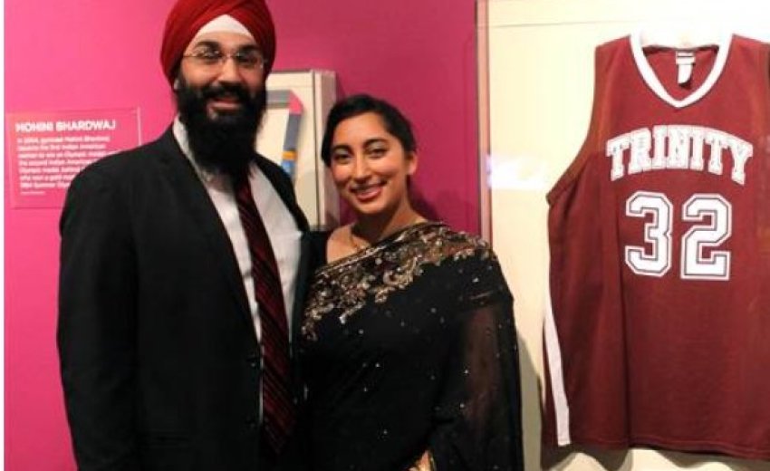 | Lakhpreet Kaur poses with her husband, Darsh Preet Singh, in March 2014 next to an exhibit at the Smithsonian's "Beyond Bollywood" exhibit, featuring his college basketball jersey. Singh was the NCAA's first turbaned Sikh American basketball player. |