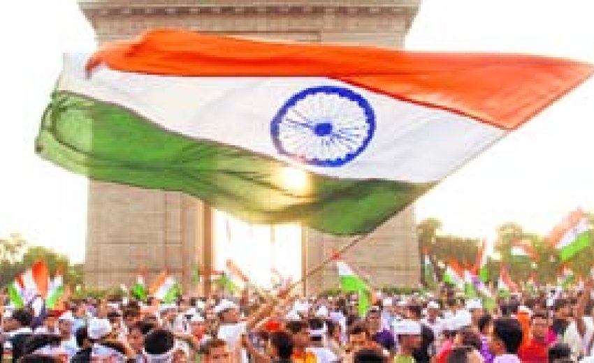 Supporters rejoice: Anna Hazare fans celebrate at the India Gate on Sunday evening.
