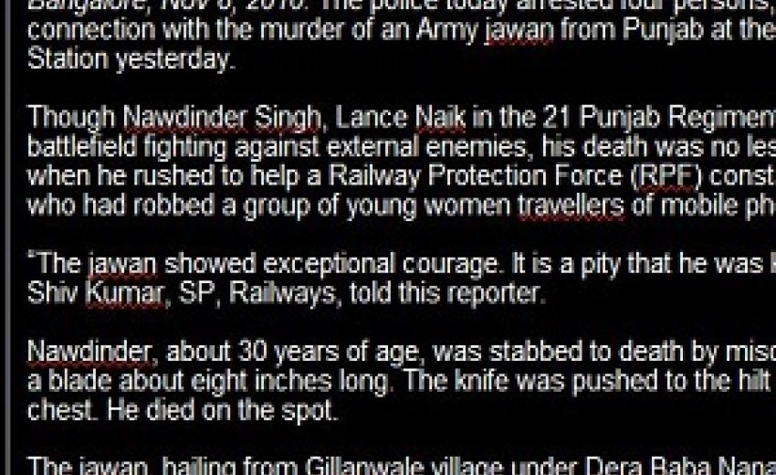 Though Nawdinder Singh, Lance Naik in the 21 Punjab Regiment, did not die in the battlefield fighting against external enemies, his death was no less heroic. He was killed when he rushed to help a Railway Protection Force (RPF) constable arrest four robbers who had robbed a group of young women travellers of mobile phones and cash.