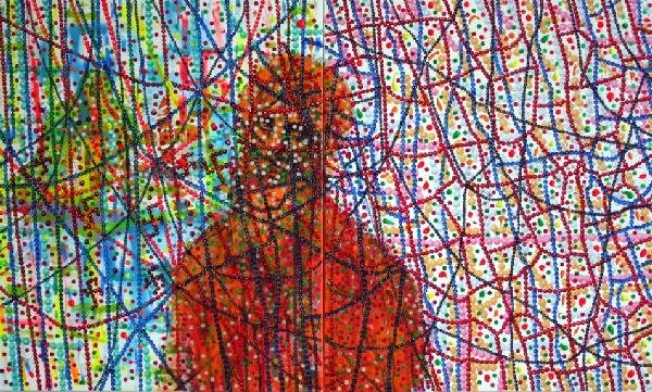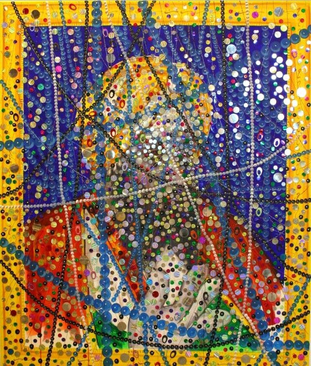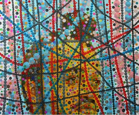 When it comes to dealing with the surface, Nirmal alternates between making use of pointillism and more geometrical op art. The attached spangles glitter, adding a striking play of reflections. The strings of pearls that divide the surface into sections may also be seen in connection with the modernist grid tradition, but merely as a comment from the wings. For under the autonomous lines and independent, unbroken colours there are portraits and brief stories to be found. This is where the festivity partly enters a zone of gravity. If you let your eyes wander towards the very earliest layers of acrylic, your gaze will meet that of the artist’s two sons, his father, Eugene Obiora, and religious masters. Their faces express authority, melancholy, discomfort, concentration. Those who are historically insignificant are brought to our attention, the physical and the banal is exalted to holiness. Actually, the choice of colours is linked to the artist’s ranking of the motifs, constituting a kind of reversed cast system. It is in these layers that we find Nirmal’s riddles, covered up and shrouded in mysterious veils. Evidently, he does not intend to divulge much, but if we invent the answers ourselves each one will find the suitable ones. First and foremost, it is a matter of taking one’s time; if we do, we will certainly find helpful hints.