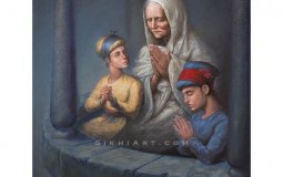 In this painting, Mata Gujri ji and the Chote Sahibzade are saying their Antim Ardas, their final prayer, in the cold tower where they were imprisoned by the Mughal police, before execution.