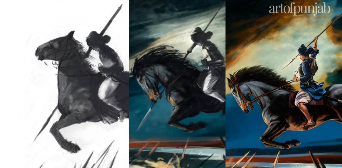 Kanwar Singh created the painting over many months of work, starting with a simple black and white concept which had struck him and slowly shaped this with his gift for envisioning colours and dramatic expression into a painting of epic grandeur. One key feature is the way the moon breaks behind him, shaping the clouds and light in the aspect of the Kirpan. It emphasizes the might of his will and the correctness of his actions, as if nature itself lends strength to his thrust.