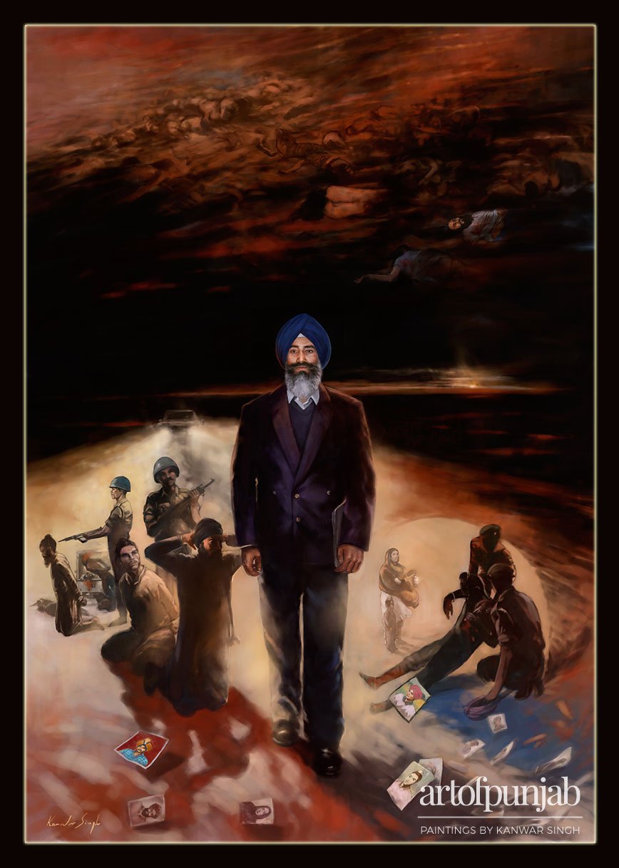 Jaswant Singh Khalra: Light Amongst Shadows, is a new painting by artist Kanwar Singh. It chronicles the life's work of human rights activist Shaheed Jaswant Singh Khalra and the events of the bloody decade (1984 -1995) in Punjab. It depicts how government forces operated with complete impunity to end the Khalistan movement, and in doing so, carried out the secret murders of thousands of its' own citizens, many of them complete innocents. This portrait of Jaswant Singh Khalra and the state of Punjab speaks to the loss of humanity when power is asserted through terror and violence. In those desperate times, the Guru inspires great souls who act as our protectors, saving us from being engulfed by total darkness. In an inspirational speech, which was to be his last, Jaswant Singh Khalra declared: