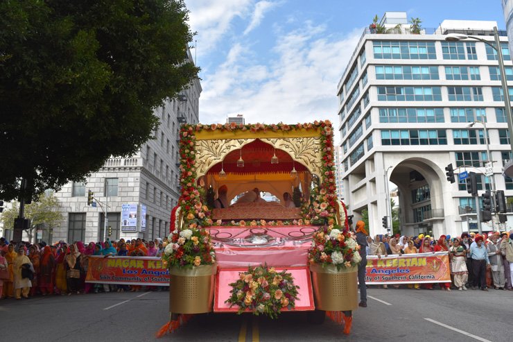 The Kirtan Darbar continued with rousing high-spirited Kirtan performed by the Chardi Kala Jetha. The final Five Ragi Jethas consisting of Bhai Jaswant Singh, Bhai Varinder Singh (Khalsa Care Foundation), Bhai Surdeep Singh, Bhai Sobha Singh (Norco Gurdwara) and under the direction of Bhai Ragbhir Singh (Walnut Gurdwara) all sang together with beautiful devotion. The Guru Ram Das Ashram Kirtan Jetha played the closing Kirtan which included Guru Gobind Singh’s Bani, “Gobinday, Mukunday, Udaaray, Apaaray, Hariang, Kariang, Nirnaamay Akaamay” as Siri Guru Granth Sahib Ji was escorted outdoors for the beginning of the resplendent Nagar Kirtan. Guru Sahib’s float was designed by Joginder Singh Sidhu and was made to look truly worthy of a King. The Sadh Sangat of the Khalsa Care Foundation did all of the float decorations for the several floats in the parade and organized the entire procession, which proceeded a couple of miles in the heart of downtown Los Angeles. The many sevadars from the Khalsa Care Foundation that were involved in the organizing of the parade included Gurdip Singh Malik, Joginder Singh Sidhu, Surinder Singh, Sukhi Singh and Sohan Singh Chowdry. There were many sumptuous sweets and snacks served after the parade organized by the Bhai Kanhaiya Sewa Dal.