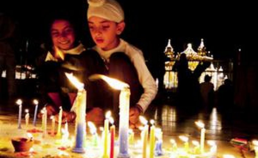 Several days later, when Guru Hargobind reached Amritsar, the Hindu festival of light, Divali, was being celebrated. In their joy at seeing their Guru again, the people lit up the whole city with candles, lights, and lamps. After almost four hundred years this tradition continues in Amritsar, and on this day the Harimandir Sahib is aglow with thousands of candles and floating lamps, strings of lights decorate the domes, and fireworks burst in the sky. Elsewhere, at Gurdwara Sahib Guru Nanak Dwara in Phoenix and around the world, Sikhs commemorate Bandi Chhor Divas, Prisoner Release Day, by lighting hundreds of candles in the evening around the Gurdwara, singing shabds in praise of Guru Hargobind by Bhai Gurdas, preparing a festive Guru ka Langar, and basking in the spirit of joy and festivity.